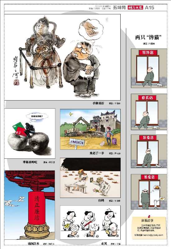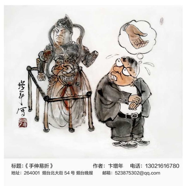 画面通过一位领导干部模样的人参观古代雕像,看到神像失去一只手,而本能地捂住自己的一只手形成一种心理暗示,来表现画面的视觉冲击力和内涵的延伸。画面表达了“触景生情,警钟长鸣”的警示效果。党的十八届四中全会提出“形成不敢腐、不能腐、不想腐的有效机制,坚决遏制和预防腐败现象”。坚决不让腐败分子“痛苦一阵子,幸福一辈子”,而是使腐败分子“提心吊胆一阵子,痛苦折磨一辈子”。(卞增年)